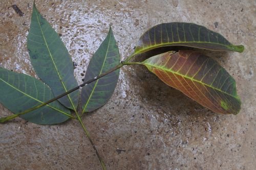 季風性落葉病可危害橡膠樹葉片、嫩枝和膠果。嫩葉感病初期呈暗綠色水漬狀病斑,隨后變黑,凋萎脫落,新落的病葉一般葉色濃綠新鮮、葉面無其他異常現象,若將葉柄剖開,可見髓部變為黑褐色;老葉的典型癥狀一般是葉柄基部先感病,初期呈水漬狀黑色條斑,病部溢出1-2滴凝膠,凝膠初為白色,后變黑。嚴重發生時,病斑在葉柄上擴展,整個葉片連同葉柄很快脫落。枝條感病后,在綠色部分出現凝膠和水漬狀暗斑,隨后回枯變褐色,葉片凋萎下垂,掛在干枝上不易脫落。