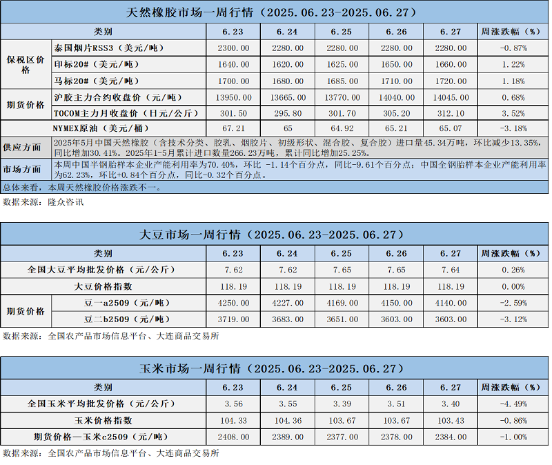 天然橡膠、大豆、玉米市場一周行情(2025.06.23-06.27)
