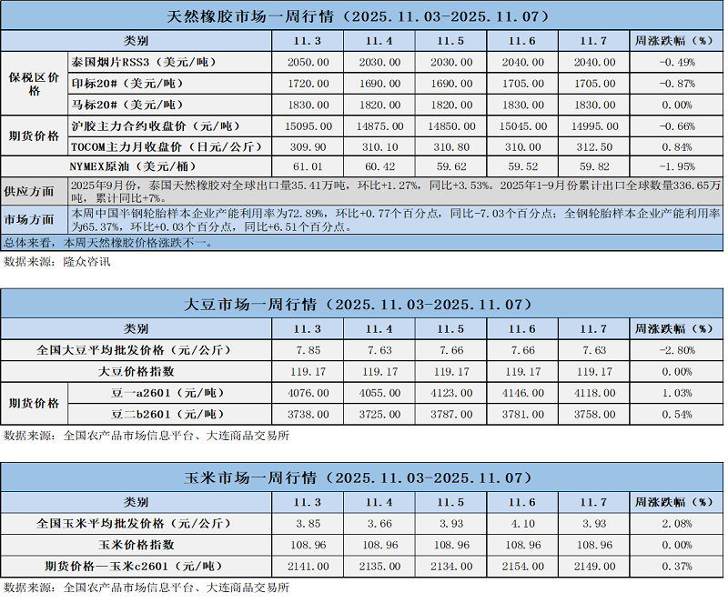 天然橡膠、大豆、玉米市場一周行情(2025.11.03-11.07)