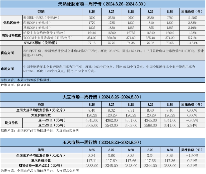 天然橡膠、大豆、玉米市場一周行情(2024.08.26-08.30)