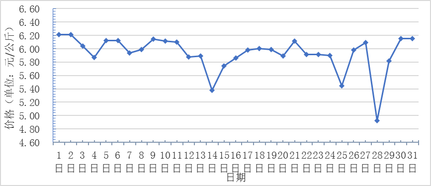 3月,全國重點(diǎn)監(jiān)測(cè)農(nóng)產(chǎn)品批發(fā)市場(chǎng)香蕉總交易量達(dá)2.2萬噸,同比下降18.5%,環(huán)比增長(zhǎng)29.4%;總交易價(jià)值12278.1萬元,同比下降14.2%,環(huán)比增長(zhǎng)24.8%。日平均價(jià)格最高為6.2元/千克,最低為4.9元/千克,全月平均價(jià)格為5.9元/千克,同比增長(zhǎng)11.5%,環(huán)比下降0.5%(注:按環(huán)比平均價(jià)格按兩位小數(shù)計(jì)算)(每日價(jià)格變化如圖)。
