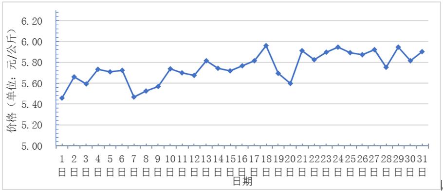 12月,全國(guó)重點(diǎn)監(jiān)測(cè)農(nóng)產(chǎn)品批發(fā)市場(chǎng)香蕉總交易量達(dá)9.5萬噸,同比上漲10.5%,環(huán)比上漲5.6%;總交易價(jià)值 56723.6萬元,同比上漲50.8%,環(huán)比上漲16.7%。日平均價(jià)格最高為6元/千克,最低為5.5元/千克,全月平均價(jià)格為5.8元/千克,同比上漲23.4%,環(huán)比上漲9.4%(每日價(jià)格變化如圖)。