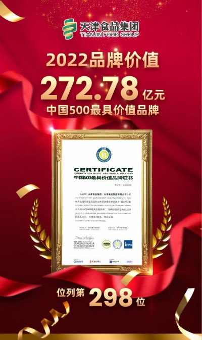 7月26日,由世界品牌實驗室(World Brand Lab)主辦的(第十九屆)“世界品牌大會”在北京舉行,會上發布了2022年《中國500最具價值品牌》榜單。“天津食品集團”作為天津國有企業行業品牌代表,以品牌價值272.78億元首次登榜,位列總榜單298名。“王朝”品牌以品牌價值240.78億元,位列總榜單327名。