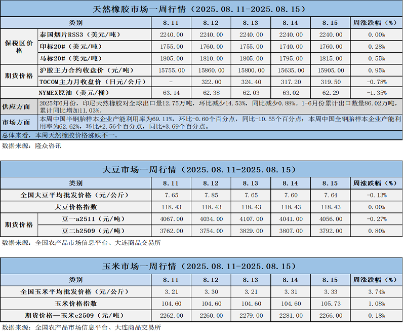 天然橡膠、大豆、玉米市場(chǎng)一周行情(2025.08.11-08.15)