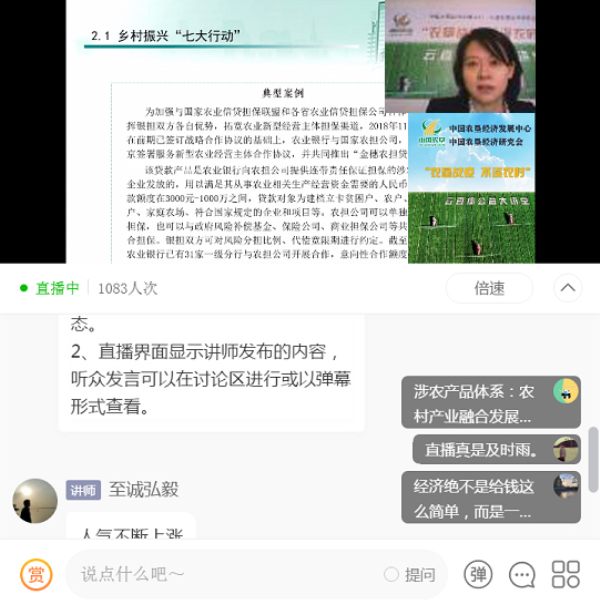 為貫徹落實中央關于統籌推進新冠肺炎疫情防控和經濟社會發展工作的部署要求,4月3日上午,由中國農墾經濟發展中心、中國農墾經濟研究會主辦的“農墾戰疫 不誤農時”云直播公益大講堂首場開講。直播由中國農墾經濟發展中心副主任、中國農墾經濟研究會秘書長陳忠毅主持,邀請中國農業銀行總行三農對公業務部農業金融處處長何源源講授《“三農”金融服務助力農墾發展》,全國各墾區、農場及相關單位人員1400余人在線觀看,反響熱烈,效果良好。