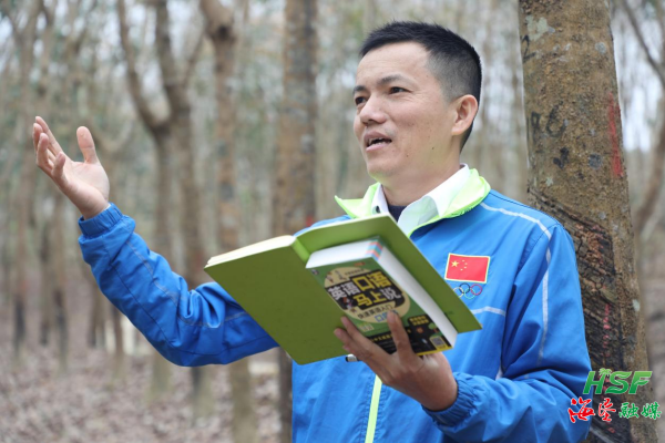 清晨的膠林,陽光透過參差的橡膠葉,灑落在全國割膠狀元虞海濃的身上。他手捧著英語書,邊讀邊記,不時在筆記本上記錄不熟悉的單詞。作為海南橡膠加釵分公司生產(chǎn)技術(shù)部部長,常年與割膠打交道的他,瘋狂學(xué)英語卻成了他最近的常態(tài)。