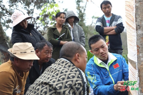 “我們調(diào)研時發(fā)現(xiàn),當(dāng)?shù)氐母钅z技術(shù)仍停留在傳統(tǒng)的‘拉刀’階段。據(jù)觀察統(tǒng)計,當(dāng)?shù)啬z工使用拉刀技術(shù)每小時能割膠120株,這一速度遠(yuǎn)超中國膠工使用推刀技術(shù)的70至80株。”何興輝說,“可速度的提升并不意味著整體效益的提升。我們注意到,他們在使用拉刀技術(shù)的過程中,對橡膠樹有較大的傷害,出現(xiàn)了不同程度的死皮現(xiàn)象,甚至‘樹瘤’情況,這對于橡膠樹的長期生長與產(chǎn)能無疑是一個巨大的隱患。”