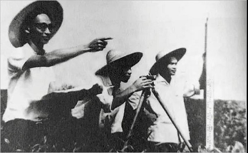 野外工作開始后,大學生們每天都要抱一大捆竹子、木樁、測繩,早出晚歸。因為測量時首先用經緯儀測好2條互相垂直的基線,再在角線上插上竹竿,即按三點成一線的原理延伸,邊插邊量,交匯成300畝大的網格。這種測量方法名叫“方格控制測量”,方法簡單易行,且不需要太多儀器。