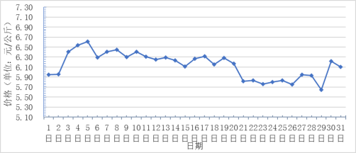 10月,全國重點監測農產品批發市場香蕉總交易量達2.6萬噸,同比下降16.1%,環比上漲4%;總交易價值16145.8萬元,同比下降9.0%,環比上漲2.1%。日平均價格最高為6.6元/千克,最低為5.7元/千克,全月平均價格為6.1元/千克,同比上漲13.0%,環比下降3.2%(每日價格變化如圖)。
