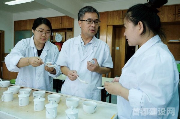 京華茶業公司總經理助理、“北京茉莉花茶拼配工藝”非物質文化遺產項目第七代傳承人樓國柱(中)進行茶葉審評。