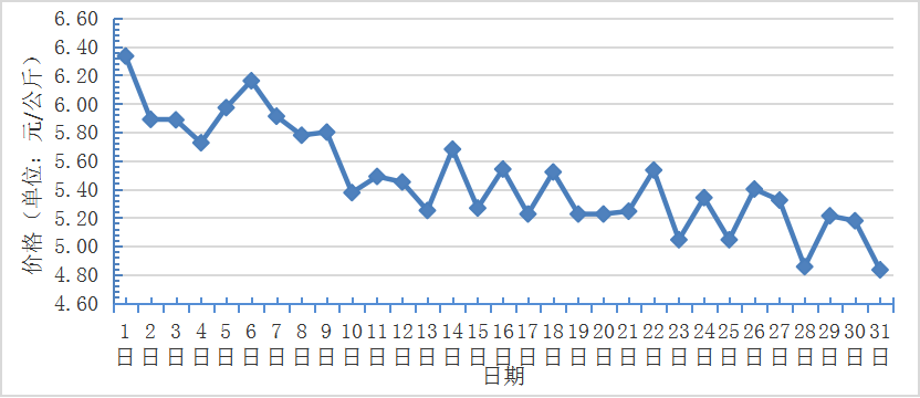 7月,全國重點監(jiān)測農(nóng)產(chǎn)品批發(fā)市場香蕉總交易量達(dá)2.2萬噸,同比下降4.3%,環(huán)比上漲4.8%;總交易價值11932.6萬元,同比下降6.4%,環(huán)比下降2.8%。日平均價格最高為6.3元/千克,最低為4.8元/千克,全月平均價格為 5.5元/千克,同比下降6.7%,環(huán)比下降14.1%(每日價格變化如圖)。