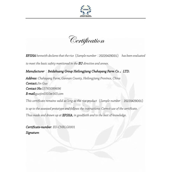 5月7日,查哈陽(yáng)農(nóng)場(chǎng)接到了歐洲食品安全與健康協(xié)會(huì)食品安全檢測(cè)中心發(fā)來(lái)的檢測(cè)證書,該場(chǎng)產(chǎn)區(qū)的3個(gè)品種的大米樣品通過(guò)了歐洲食品安全規(guī)定的所有747項(xiàng)檢測(cè)指標(biāo),這標(biāo)志著查哈陽(yáng)大米成為中國(guó)第一個(gè),也是現(xiàn)在唯一可以正式進(jìn)入歐盟市場(chǎng)的國(guó)產(chǎn)大米,也意味著中國(guó)擁有了第一款世界食品安全等級(jí)最高的大米,查哈陽(yáng)大米獲得走向世界的通行證。