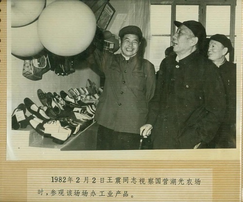 1975年春,湖光農(nóng)場經(jīng)濟陷入蕭條。當(dāng)王震視察中看到倒塌的豬欄、損毀的雞場、枯黃的橡膠樹時,他鼓勵大家:“烏云總會散去的,我們要挺起腰桿來,一手恢復(fù)多種經(jīng)營,一手搞副食品加工,為城市服務(wù)……”1981年,他再次視察農(nóng)場時指示:希望湖光農(nóng)場在農(nóng)工商綜合經(jīng)營方面帶好頭,做個榜樣。