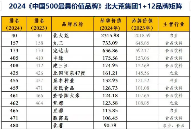 6月19日,由世界品牌實(shí)驗(yàn)室(World Brand Lab)主辦的2024 年(第二十一屆)世界品牌大會(huì)暨 2024年(第二十一屆)中國500最具價(jià)值品牌發(fā)布會(huì)在北京中國大飯店舉行,會(huì)上發(fā)布了2024年中國500最具價(jià)值品牌分析報(bào)告。北大荒農(nóng)墾集團(tuán)有限公司旗下的“北大荒”“九三”“完達(dá)山”“豐緣”“建三江”“北國寶泉47度”“墾豐種業(yè)”“親民食品”“查哈陽大米”“荒都”“豆都”“雁窩島”“北薯”13個(gè)品牌榮登中國500最具價(jià)值品牌排行榜。其中,“北大荒”品牌價(jià)值達(dá)2315.98億元,排名第40位,20年間,品牌價(jià)值增長129.3倍,“豆都”“雁窩島”“北薯”3個(gè)品牌首次上榜。