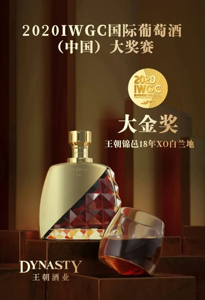 2020國際葡萄酒(中國)大獎賽(IWGC)在山東沃族(蓬萊)葡萄酒莊園滿落幕,本次大賽在金獎的基礎上產生大金獎,比賽中,王朝錦邑18年XO白蘭地表現突出,在眾多中外葡萄酒中脫穎而出,斬獲2020國際葡萄酒(中國)大獎賽(IWGC)大金獎。