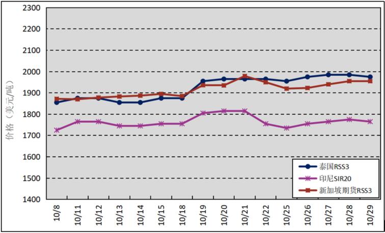 國外主產區:10月,泰國RSS3平均價格為1924美元/噸,環比上漲95美元/噸,最高價為1985美元/噸,最低價為1855美元/噸;印尼SIR20平均價格為1765美元/噸,環比上漲107美元/噸,最高價為1815美元/噸,最低價為1725美元/噸;新加坡RSS3期貨主力合約月均結算價格為1916美元/噸,環比上漲128美元/噸,最高價為1979美元/噸,最低價為1870美元/噸。