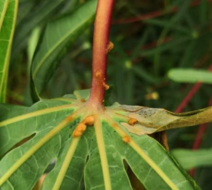 (三)監(jiān)測防控。加強木薯苗期病害監(jiān)測,發(fā)現(xiàn)葉片上出現(xiàn)角形病斑或水浸狀病斑時,可用乙蒜素進行防治。對于莖基部出現(xiàn)大量白色至黃褐色溢出物的重病植株,應拔除補種。