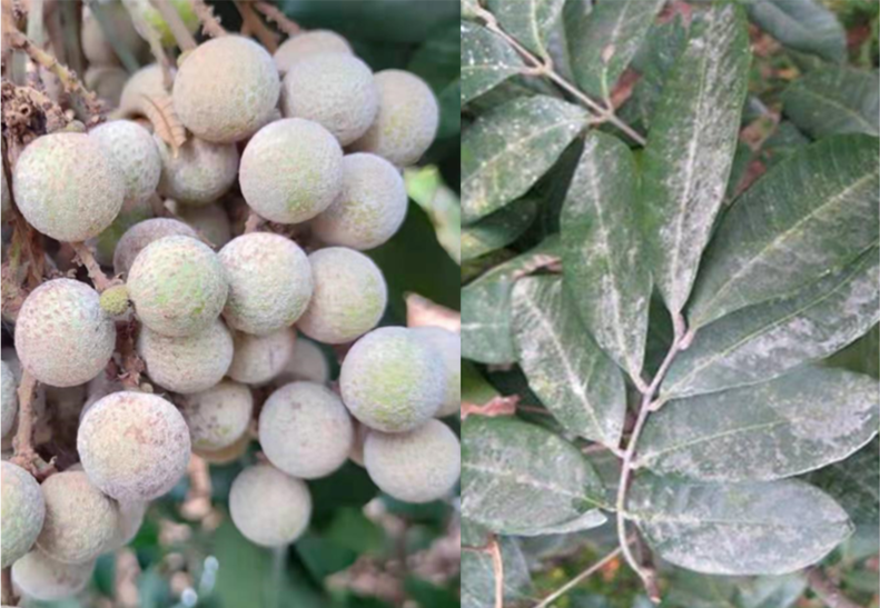 廣東與廣西是我國龍眼的重要主產區,現正陸續進入采收旺季。今年夏季持續高溫高濕,導致部分果園龍眼白霉病發生嚴重。該病主要為害接近成熟的龍眼果實及葉片,往往先發生在樹冠中下層枝葉稠密的果穗或葉片上。在果實上,病菌菌絲和孢子形成的一層白色霉狀物可覆蓋整個果實表面,導致部分果枝干枯和果實脫落或果皮暗褐色、果肉變質腐爛;中度和輕度發病的果實,雖果肉未腐爛,但品質與風味下降。受害葉片則正面覆蓋有一層白色霉狀物,雖不形成壞死病斑,但引致葉片早衰。