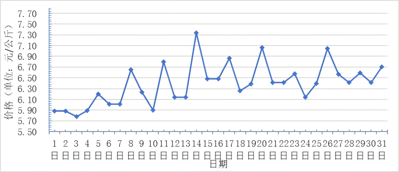 8月,全國重點監測農產品批發市場香蕉總交易量達3.4萬噸,同比上漲47.8%,環比上漲47.8%;總交易價值20902.6萬元,同比上漲44.1%,環比上漲63.9%。日平均價格最高為7.3元/千克,最低為5.8元/千克,全月平均價格為 6.4元/千克,同比上漲4.9%,環比上漲8.5%(每日價格變化如圖)。