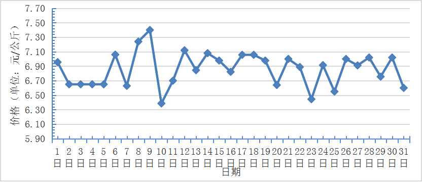 5月,全國重點監測農產品批發市場香蕉總交易量達2.4萬噸,同比下降7.7%,環比增長9.1%;總交易價值15319.9萬元,同比增長16.8%,環比增長9.4%。日平均價格最高為7.4元/千克,最低為6.4元/千克,全月平均價格為6.9元/千克,同比增長32.7%,環比增長4.5%(每日價格變化如圖)。
