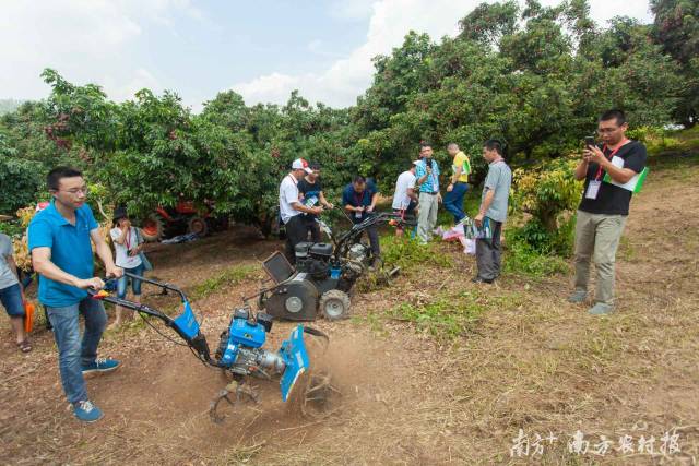 “看到了現代果園的希望。”讓黃斌民感嘆的是位于從化區鰲頭黃羅村的綠色家園荔枝生產示范基地。在這里,掘孔機、中耕管理機、肥料撒播機、多功能割草機、樹枝粉碎機、高枝修剪機、伸縮式修剪鋸、搬運車、高空作業機、各類噴霧直播機械等60余臺農業機械設備進行了展示和演示,分別用于解決山地果園運輸、果園采摘、果園殘枝利用、果園管理等機械化應用問題。“震撼!”韓沛新參觀后感嘆道,他認為果園機械化采摘演示尤其壯觀。農業機械化的實現能解放勞動力,對荔枝產業乃至水果產業都意義重大。