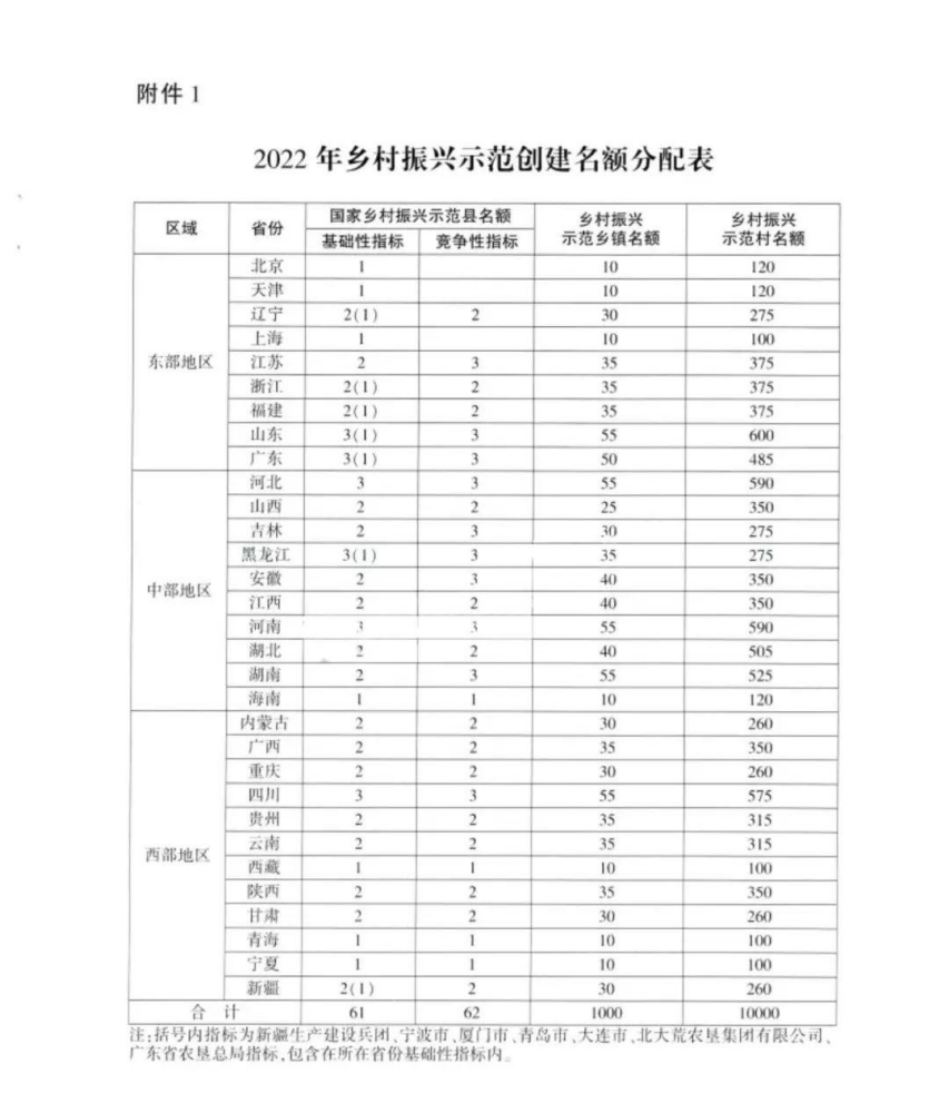 2022年,立足縣、鄉、村資源稟賦和發展基礎,體現東、中、西部區域特色,農業農村部、國家鄉村振興局組織創建100個左右國家鄉村振興示范縣,省級農業農村部門、鄉村振興局組織創建1000個左右鄉村振興示范鄉鎮、10000個左右鄉村振興示范村,分層級推進示范創建。力爭用5年左右時間,開展創建工作的國家鄉村振興示范縣基本覆蓋全國各市(地、州、盟)。各地要結合年度重點工作部署,扎實推進示范創建工作。