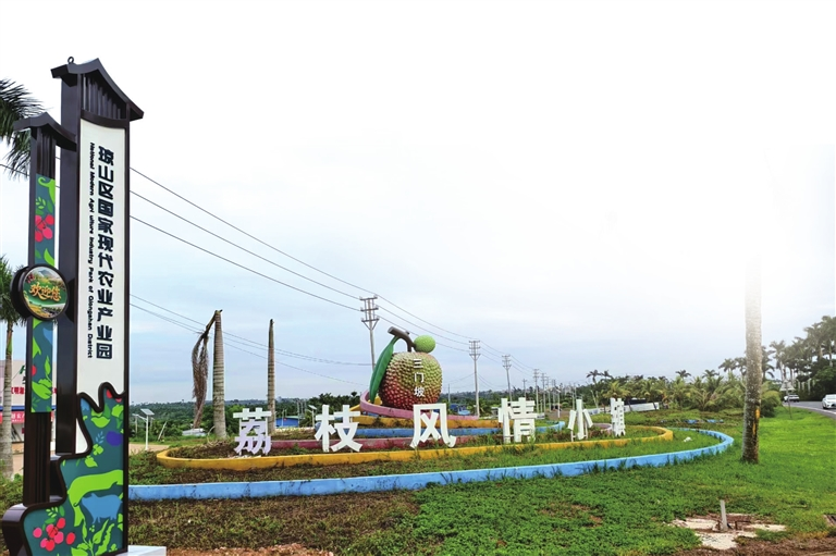 從海口出發(fā),沿223國道一路南行,在一片一眼望不到邊的荔枝園旁,一顆碩大的“荔枝”闖入眼簾,旁邊“荔枝風情小鎮(zhèn)”幾個大字,讓人馬上意識到已抵達三門坡鎮(zhèn)。