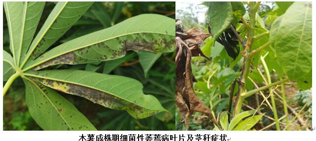 危害癥狀:病原從下層葉片開始入侵,初為水漬狀病斑,墨綠色,近圓形或不規則形,隨后擴大并變成灰褐色。典型成熟病斑褐色,中央較深,邊緣黑褐色,病斑周圍的葉脈常出現輕微變色(通常為黑色)。病斑有時擴展并匯合成不規則大斑塊。發病后期病斑中央破裂、呈穿孔狀,嚴重時,葉片變黃并干枯脫落。木薯整個生長期均可受其危害。