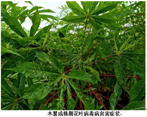 危害癥狀:感病葉片初為褪綠斑點,逐漸擴大,整片葉呈花葉狀;嚴重時葉片變小,背面有時可見突起,葉片中部和基部常收縮成蕨葉狀,受侵染葉片癥狀嚴重程度隨季節、栽培品種不同而異。在涼爽的雨季,病害癥狀表現最嚴重,夏季常隱癥或淺花葉。煙粉虱是田間傳播的主要介體。
