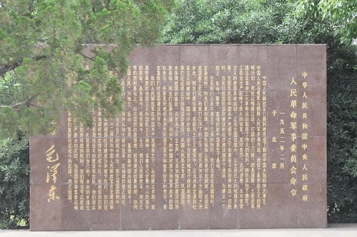 農建四師暨淮海農場歷史陳列館是在農建四師大院舊址上建起來的。走進院門,迎面矗立著的是一座由大理石雕刻的碑文?!皩⒐鈽s的祖國經濟建設任務賦予你們……當祖國需要召喚你們的時候,我將命令你們重新拿起戰斗武器,捍衛祖國。”游客來到農建四師大院參觀時,陳列館解說員首先向游客介紹毛主席的這份命令。