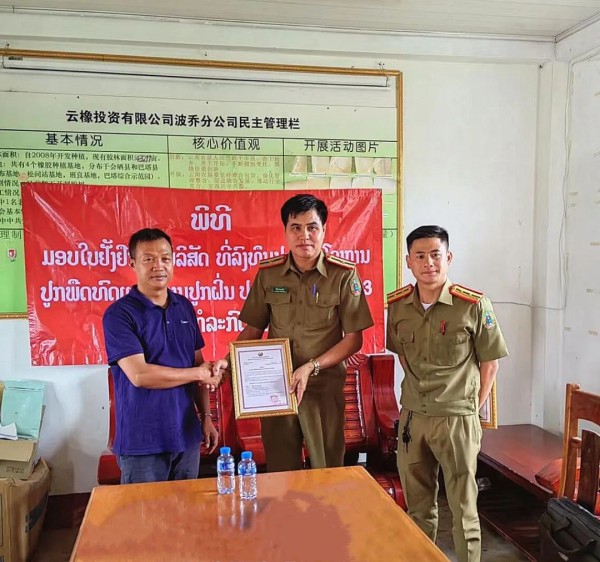 7月6日,老撾波喬省公安廳罌粟替代種植檢查考核領導小組副組長坎恩·酸巴帝到云橡投資有限公司波喬分公司頒發“罌粟替代種植優秀企業”證書。