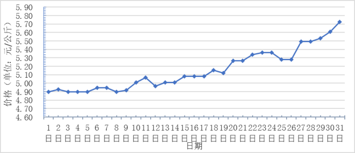 5月,全國重點監測農產品批發市場香蕉總交易量達2.6萬噸,同比上漲13.0%,環比下降16.1%;總交易價值13112.7萬元,同比下降19.9%,環比下降20.7%。日平均價格最高為5.7元/千克,最低為4.9元/千克,全月平均價格為 5.2元/千克,同比下降18.8%,環比下降3.7%(每日價格變化如圖)。