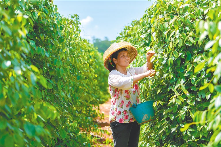 “現(xiàn)在是胡椒掛果期,每天一早,我就來采摘胡椒,直到中午才回家吃飯。”在種植基地里,黃麗貞是最早到達(dá)、最晚離開的那批人之一。2015年,在公司工會(huì)幫扶下,她管起5畝地800株胡椒,如今每年能有三四萬元收入。