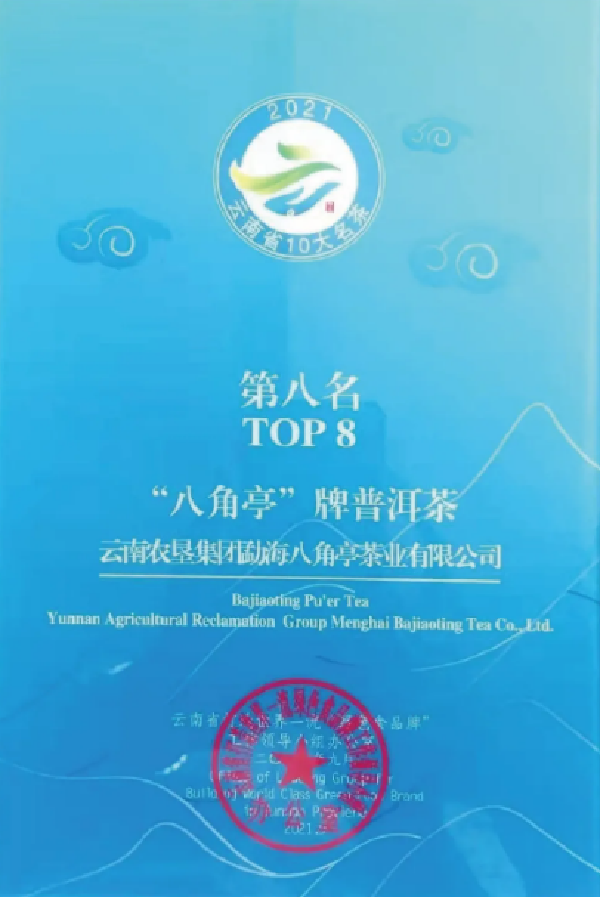 2021年,公司緊跟茶業集團戰略部署,圍繞“改革創新”這一年度主題,深耕產品研發和市場推廣,“八角亭”牌普洱茶再次榮獲云南省“10大名茶”稱號。